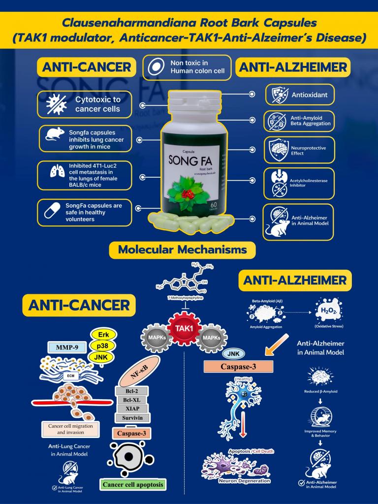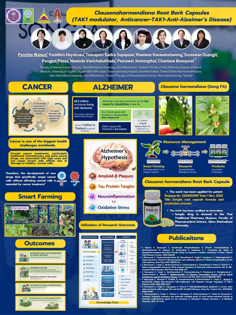 ผลงานวิจัย แคปซูลเปลือกรากส่องฟ้าต้านมะเร็ง การนำเปลือกรากของ Clausena harmandianaถูกพัฒนาเป็นแคปซูล “Song Fa” โดยแสดงฤทธิ์ต้านมะเร็งและต้านโรคอัลไซเมอร์ผ่านการควบคุม TAK1 อีกทั้งไม่เป็นพิษต่อเซลล์ปกติ และมีความปลอดภัยในอาสาสมัครสุขภาพดี ซึ่งสนับสนุนศักยภาพในการพัฒนาเป็นยารักษาในอนาคต