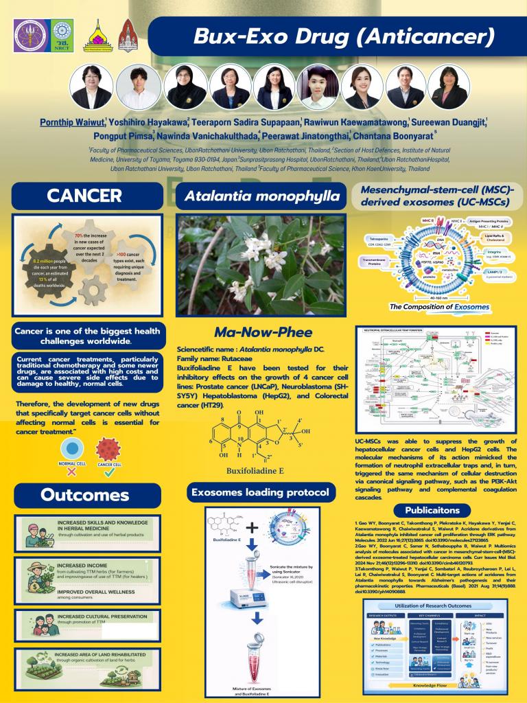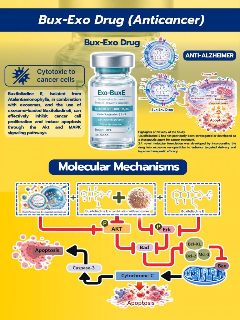 ผลงานวิจัย Bux-Exo Drugs (Anti-Cancer) Exosomes จาก stem cellsที่บรรจุ Buxifoliadine E (Bux-Exo) สามารถกระตุ้นการตายของเซลล์แบบ apoptosis และยับยั้งการเพิ่มจำนวนของเซลล์มะเร็งตับชนิด hepatoblastoma โดยเพิ่มการกระตุ้นของ caspase-3 และการแสดงออกของ Bax ผ่านกลไกของเส้นทางสัญญาณ Akt และ MAPK ซึ่งแสดงให้เห็นถึงศักยภาพในการพัฒนาเป็นกลยุทธ์การรักษามะเร็งในอนาคต