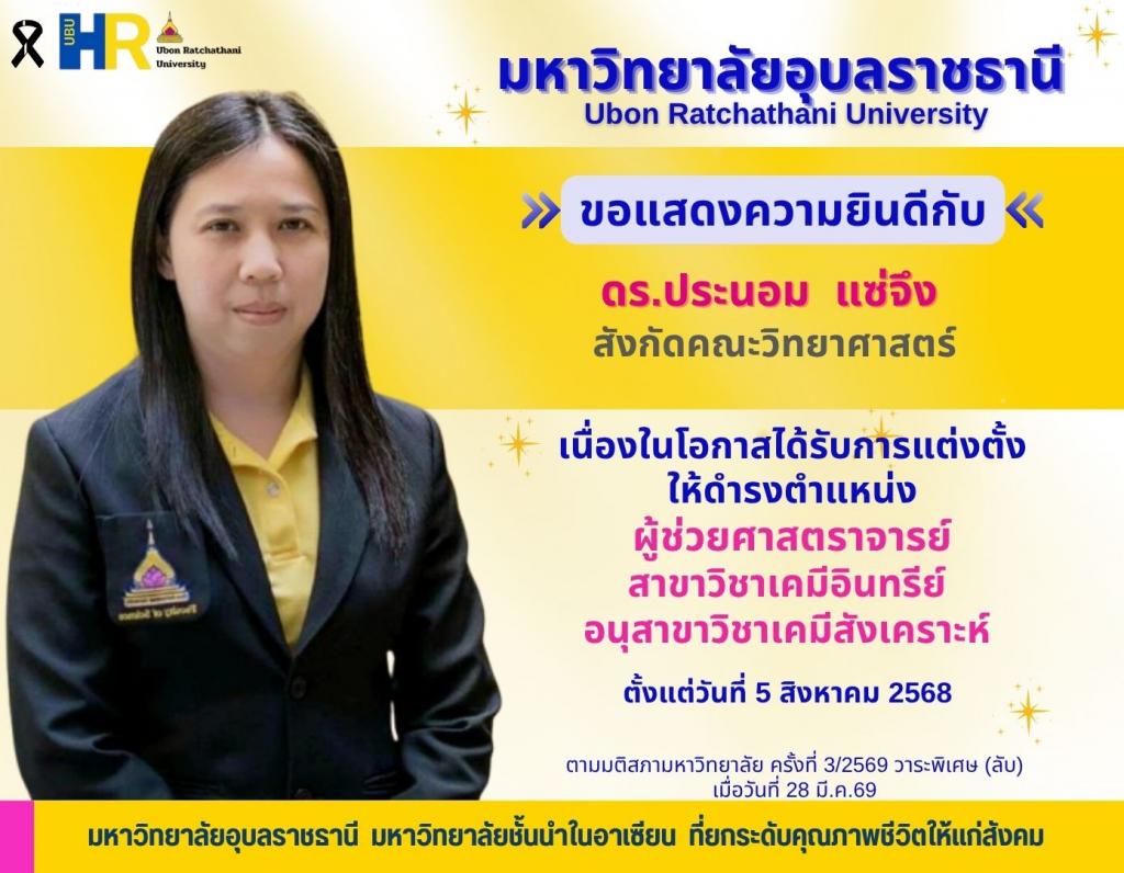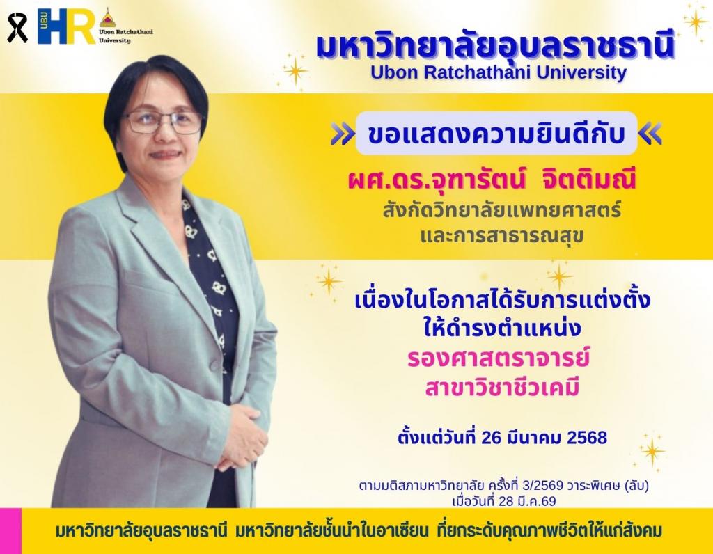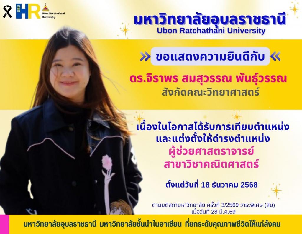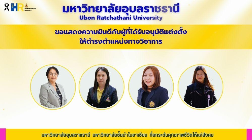 สภามหาวิทยาลัยอุบลราชธานี ในการประชุมครั้งที่ 3/2569 วาระพิเศษ (ลับ) เมื่อวันที่ 28 มีนาคม 2569 มีมติอนุมัติให้ดำรงตำแหน่งทางวิชาการ จำนวน 4 ราย ดังนี้