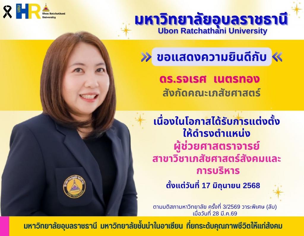 2. นางสาวรจเรศ เนตรทอง พนักงานมหาวิทยาลัย ตำแหน่งอาจารย์ สังกัดภาควิชาเภสัชกรรมปฏิบัติ คณะเภสัชศาสตร์ ดำรงตำแหน่งผู้ช่วยศาสตราจารย์ สาขาวิชาเภสัชศาสตร์สังคมและการบริหารตั้งแต่วันที่ 17 มิถุนายน 2568 ซึ่งเป็นวันที่ฝ่ายเลขานุการคณะกรรมการพิจารณาตำแหน่งทางวิชาการได้รับเรื่อง