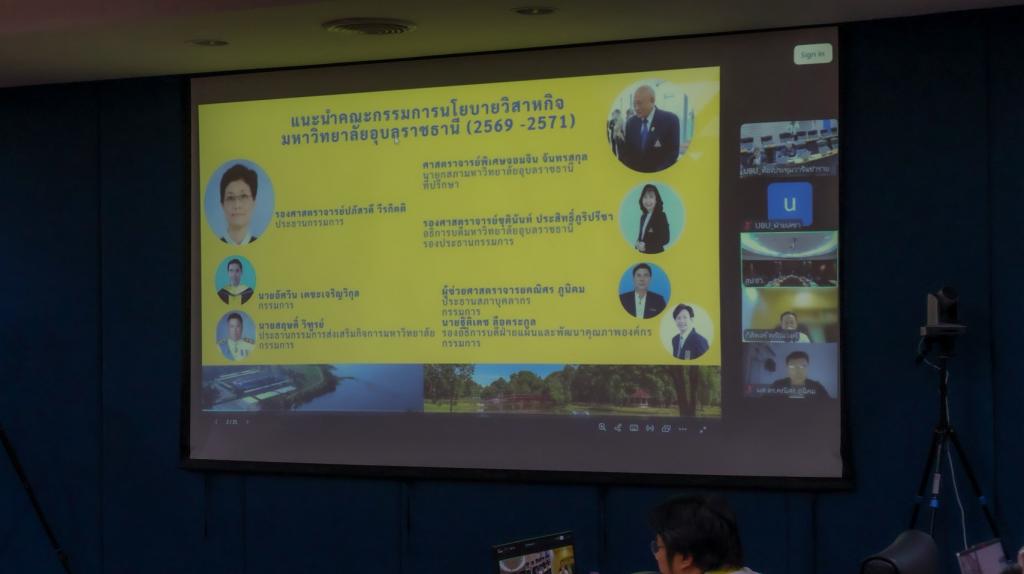 มหาวิทยาลัยอุบลราชธานี โดยศูนย์นวัตกรรมบริการวิชาการ จัดการประชุมคณะกรรมการนโยบายวิสาหกิจ มหาวิทยาลัยอุบลราชธานี ครั้งที่ 1/2569 เพื่อวางกรอบทิศทางและกลไกการดำเนินงานวิสาหกิจของมหาวิทยาลัย โดยมี ศาสตราจารย์พิเศษจอมจิน จันทรสกุล นายกสภามหาวิทยาลัยอุบลราชธานี ที่ปรึกษาคณะกรรมการ รองศาสตราจารย์ปภัสวดี วีรกิตติ ประธานคณะกรรมการนโยบายวิสาหกิจ รองศาสตราจารย์ ดร.ชุตินันท์ ประสิทธิ์ภูริปรีชา อธิการบดี รองประธานกรรมการ พร้อมด้วย นายอัศวิน เตชะเจริญวิกุล คณะกรรมการ และคณะกรรมการผู้ทรงคุณวุฒิภายนอก ได้แก่ นายสมชาติ พงคพนาไกร นายกิติพงค์ พร้อมวงค์ และ นางวิภาดา ดวงรัตน์ ตลอดจนประธานคณะกรรมการส่งเสริมกิจการมหาวิทยาลัย และคณะผู้บริหารระดับสูงของมหาวิทยาลัย ซึ่งเป็นการประชุมในรูปแบบ Hybrid ห้องประชุมพันเอกอาทรชนเห็นชอบ สำนักงานปลัดกระทรวงการอุดมศึกษา วิทยาศาสตร์ วิจัยและนวัตกรรม (อว.) กรุงเทพฯ และห้องประชุมวารินชำราบ มหาวิทยาลัยอุบลราชธานีเมื่อวันที่ 31 มีนาคม 2569 ที่ผ่านมา