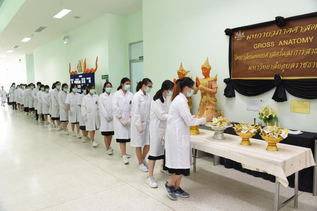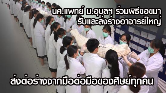เมื่อวันที่ 31พฤษภาคม 2562 ที่ผ่านมา นักศึกษาวิทยาลัยแพทยศาสตร์และการสาธารณสุขมหาวิทยาลัยอุบลราชธานี (มอบ.) พร้อมใจร่วมพิธีขอขมา รับและส่งร่างอาจารย์ใหญ่ น้อมสำนึกในพระคุณครูผู้เสียสละร่างกาย เพื่อการศึกษา โดยมี นายแพทย์ประวิ อ่ำพันธุ์ รองคณบดีฝ่ายบริหาร วิทยาลัยแพทยศาสตร์และการสาธารณสุข นำคณาจารย์ และนักศึกษา กว่า 200คน เข้างานพิธี ภาพของนักศึกษาตั้งแถวทอดยาวส่งร่างอาจารย์ใหญ่ จากร่างต่อร่าง ส่งผ่านมือต่อมือของลูกศิษย์ทุกคน จากห้องมหกายวิภาคศาสตร์ ไปยังรถรับส่งที่จอดบริเวณหน้า อาคารสมจิตต์ ยอดเศรณี ซึ่นับเป็นภาพที่สุดตราตรึงใจยิ่ง