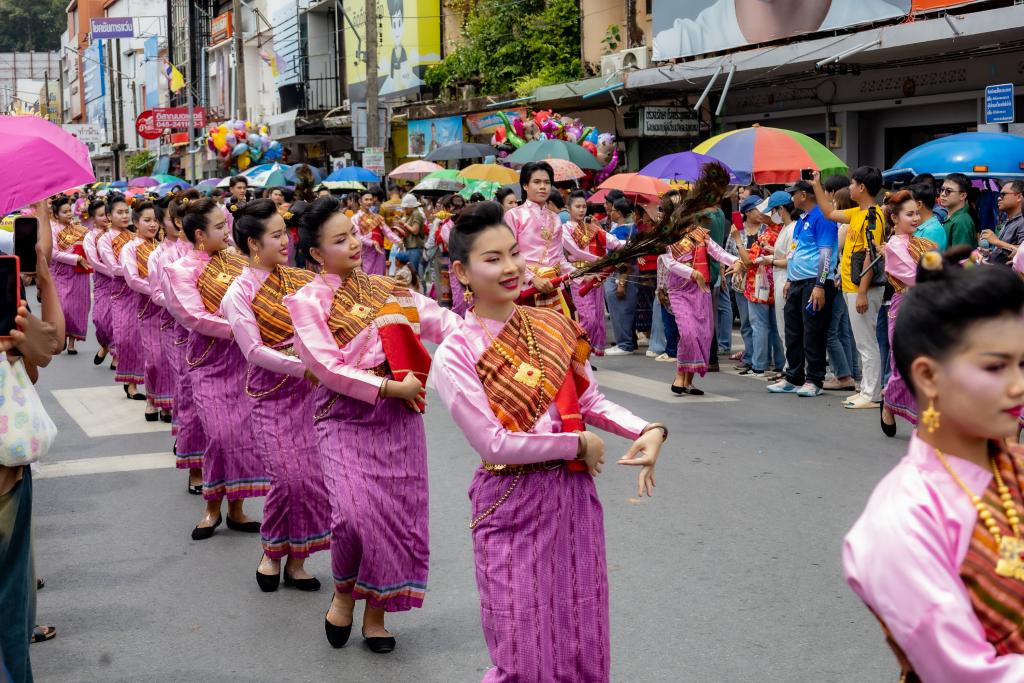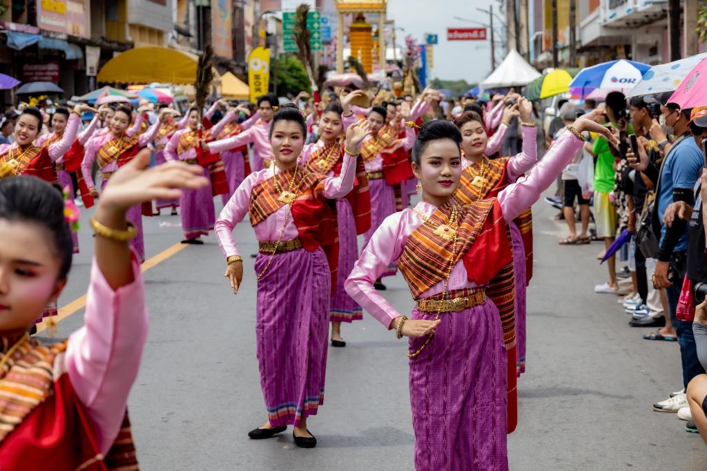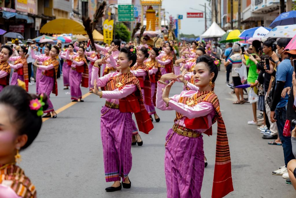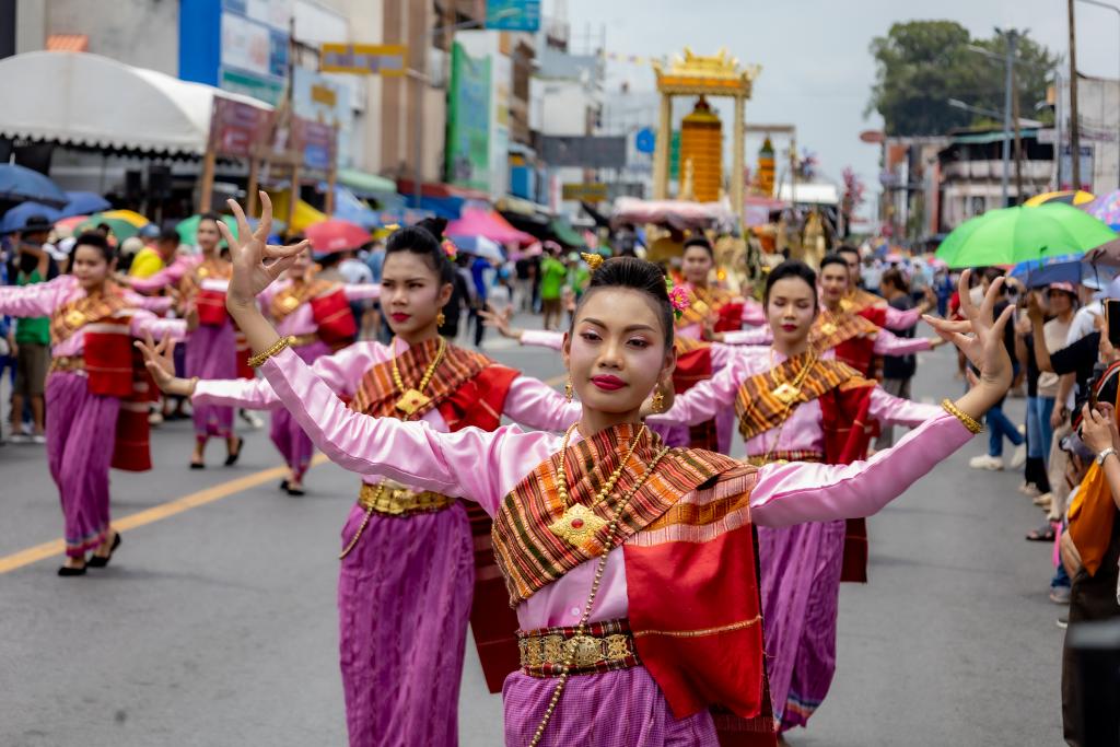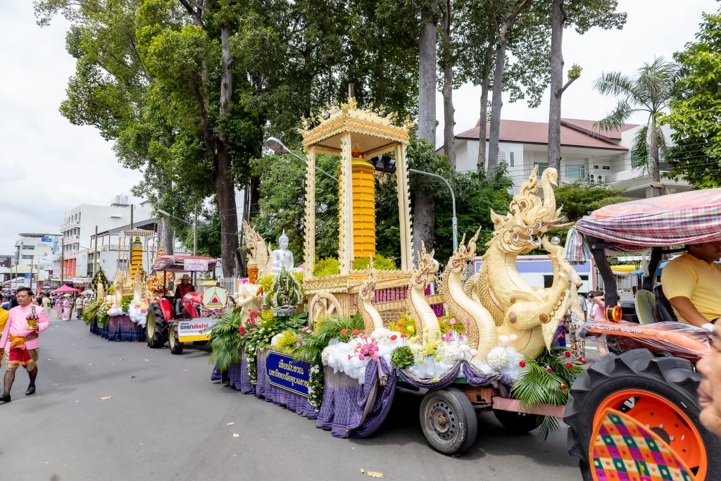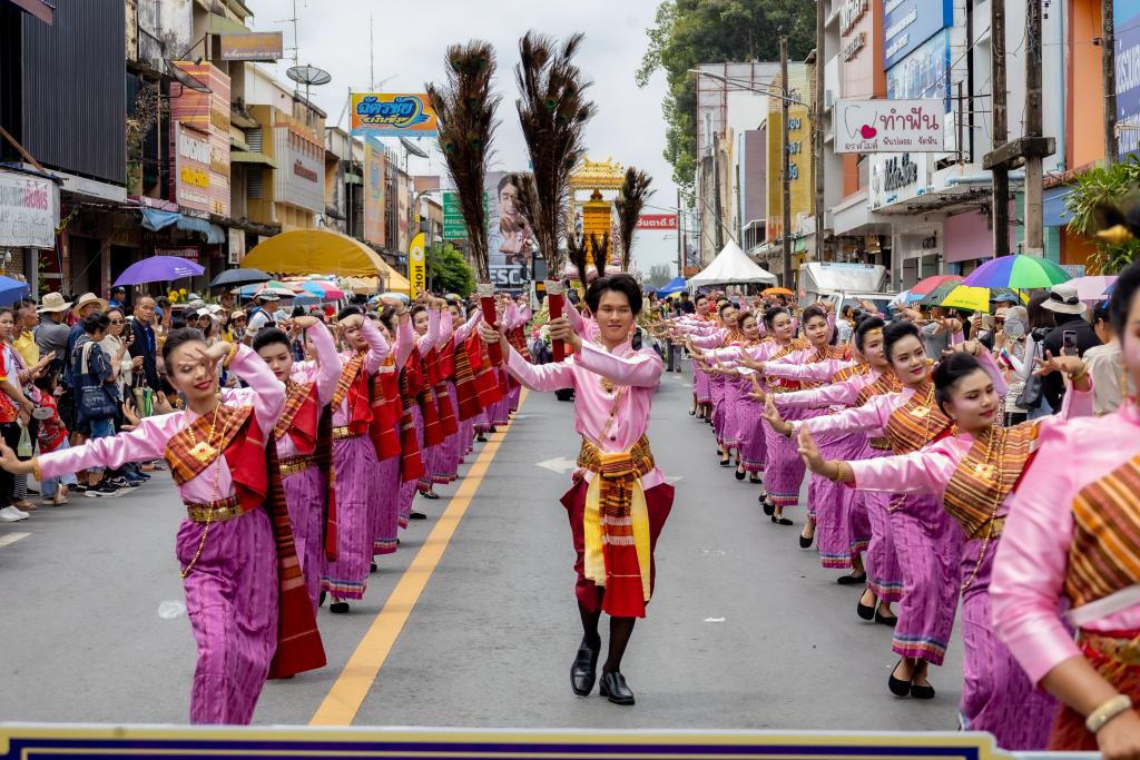 ในส่วนของขบวนฟ้อนรำ“เทียนส่องธรรม” ซึ่งมีนักศึกษามหาวิทยาลัยอุบลราชธานี จำนวน 36 คน นางรำร่วมฝึกซ้อม โดยมีผู้ช่วยศาสตราจารย์ ดร.ศิริเพ็ญ อัตไพบูลย์ และคณะครู ออกแบบท่ารำ ฝึกสอนและฝึกซ้อมได้อย่างงดงามและพร้อมเพรียง ทั้งนี้ คณะศึกษาศาสตร์ โดย อาจารย์พัน พงษ์ผล ผู้ช่วยคณบดีฝ่ายพัฒนานักศึกษาและศิษย์เก่าสัมพันธ์ ได้ประพันธ์เพลงประกอบขบวนฟ้อนรำ เพลงไชยะ ซึ่งเป็นเพลงที่สร้างสรรค์ทำนองขึ้นจากทำนองสวด “ไชยน้อย”(จุลไชยมงคลคาถา) โดยเนื้อหาจะสื่อถึงแสงสว่างของเทียนเปรียบเสมือนแสงธรรมที่นำทางชีวิต โดยความเชื่อว่าแสงสว่างจะนำทางสู่นิพพานได้ เป็นวิถีชีวิตชาวอีสานที่ผูกพันกับพุทธศาสนา ประเพณีการทำบุญในฮีต 12 คอง 14 ที่สะท้อนความศรัทธาในพระพุทธศาสนา และแสดงถึงการน้อมนำธรรมะมาเป็นแนวทางในการดำเนินชีวิต และดนตรีออกท้ายเพลงเร็ว ด้วยเพลง “ซุ้มลาวแพน” เป็นบทเพลงที่สื่อซึ่งนกยูงแพนหาง ตามความเชื่อในอาณาจักรล้านช้าง ที่มีความเชื่อว่า นกยูง เป็นสัญลักษณ์แห่งความศักดิ์สิทธิ์ทางพุทธศาสนา อำนาจ และความรุ่งเรือง
